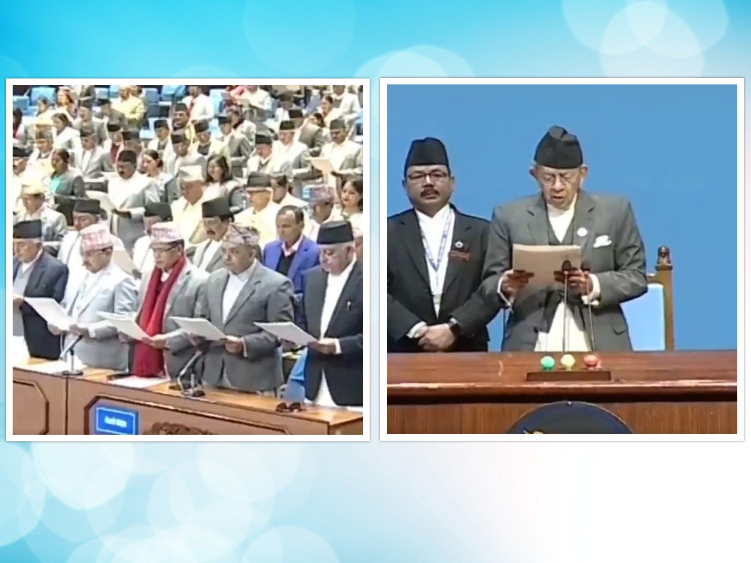 नयाँ बानेश्वरस्थित संसद भवनमा दिउँसो सवा एक बजेपछि प्रतिनिधिसभाका ज्येष्ठ सदस्य पशुपति शमशेर जबराले सांसदहरुलाई शपथ खुवाएका हुन् ।