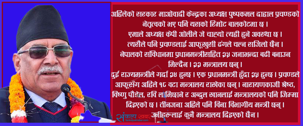 नेपालको संविधानमा प्रधानमन्त्रीसहित २५ जनाभन्दा बढी बनाउन मिल्दैन । २२ मन्त्रालय छन् । दुई राज्यमन्त्रीले गर्दा २४ हुन्छ । एक प्रधानमन्त्री हुँदा २५ हुन्छ । प्रचण्डले आफूसँग अहिले १८ वटा मन्त्रालय राखेका छन् । नारायणकाजी श्रेष्ठ, विष्णु पौडेल, रवि लामिछाने र अब्दुल खानलाई मन्त्रालयको पनि जिम्मा दिइएको छ । तीनजना अहिले पनि विना विभागीय मन्त्री छन् । उनीहरूलाई कुनै मन्त्रालय दिइएको छैन ।