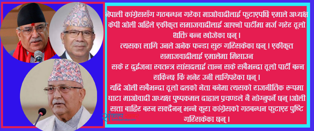 त्यसमाथि प्रचण्ड पनि एकीकृत समाजवादीलाई एमालेमा मिलाउन लागिपरेको देखिएको छ । यसले प्रचण्डको शक्ति क्षयीकरण झन् तीव्र रुपमा ओरालो लाग्ने निश्चित छ । यदि माधव नेपालको एकीकृत समाजवादीलाई अलग दलको रुपमा उनले सामेल गराउन सके भने मात्र ओलीलाई साइजमा राख्न सक्छन् । यदि ओलीले निहुँ खोजेमा कांग्रेससँग गठबन्धन गरेर भए पनि सरकार चलाउन सक्छन् ।