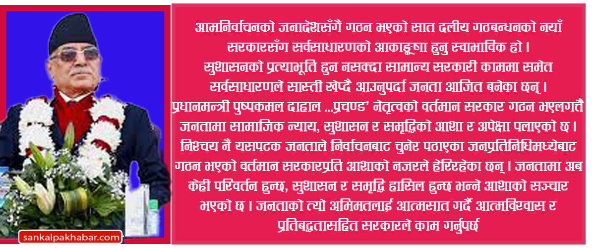 काठमाडौं । प्रत्येक नयाँ सरकारसँग जनताको अपेक्षा तथा आकाङ्क्षा बढी नै हुन्छ । आमनिर्वाचनको जनादेशसँगै गठन भएको सात दलीय गठबन्धनको नयाँ सरकारसँग सर्वसाधारणको आकाङ्क्षा हुनु स्वाभाविक हो । सुशासनकोे प्रत्याभूति हुन नसक्दा सामान्य सरकारी काममा समेत सर्वसाधारणले सास्ती खेप्दै आउनुपर्दा जनता आजित बनेका छन् । प्रधानमन्त्री पुष्पकमल दाहाल ‘प्रचण्ड’ नेतृत्वको वर्तमान सरकार गठन भएलगत्तैै जनतामा सामाजिक न्याय, सुशासन र समृद्धिको आशा र अपेक्षा पलाएको छ ।
