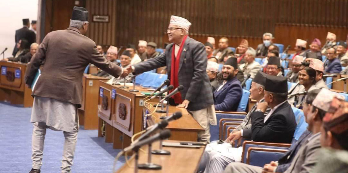 दाहाल नेतृत्वको सरकारले विश्वास गुमाउनाथ देउवा प्रधानमन्त्री हुने ओली आफैंले व्याख्या गर्नु, कांग्रेसको भागमा माछा पर्नेवाला छैन पनि भन्नु, सँगसँगै संसद विघटनको कुरा पनि दोहो¥याउनु । ओलीका यी तीनै अभिव्यक्तिलाई एकै ठाउँमा राखेर हेर्दा उनको मनसाय बुझन् थप अन्तरदृष्टि आवश्यक पर्दैन । तथापि, भविश्यमा कांग्रेसलाई सत्तामा जानबाट रोक्नका लागि ओलीसँग मात्र दुईवटा विकल्प देखिन्छन्–