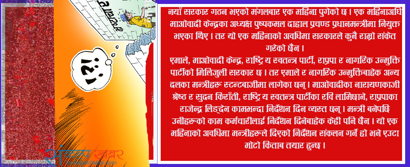 एमाले, माओवादी केन्द्र, राष्ट्रिय स्वतन्त्र पार्टी, राप्रपा र नागरिक उन्मुक्ति पार्टीको मिलिजुली सरकार छ । तर एमाले र नागरिक उन्मुक्तिबाहेक अन्य दलका मन्त्रीहरू स्टन्टबाजीमा लागेका छन् । माओवादीका नारायणकाजी श्रेष्ठ र सुदन किराँती, राष्ट्रिय स्वतन्त्र पार्टीका रवि लामिछाने, राप्रपाका राजेन्द्र लिङ्देन कामभन्दा निर्देशन दिन व्यस्त छन् । मन्त्री बनेपछि उनीहरूको काम कर्मचारीलाई निर्देशन दिनेबाहेक केही पनि छैन । यो एक महिनाको अवधिमा मन्त्रीहरूले दिएको निर्देशन संकलन गर्ने हो भने एउटा मोटो किताब तयार हुन्छ ।