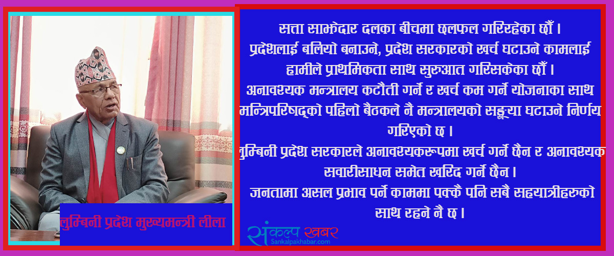 सत्ता साझेदार दलका बीचमा छलफल गरिरहेका छौँ । प्रदेशलाई बलियो बनाउने, प्रदेश सरकारको खर्च घटाउने कामलाई हामीले प्राथमिकता साथ सुरुआत गरिसकेका छौँ । अनावश्यक मन्त्रालय कटौती गर्ने र खर्च कम गर्ने योजनाका साथ मन्त्रिपरिषद्को पहिलो बैठकले नै मन्त्रालयको सङ्ख्या घटाउने निर्णय गरिएको छ । लुम्बिनी प्रदेश सरकारले अनावश्यकरूपमा खर्च गर्ने छैन र अनावश्यक सवारीसाधन समेत खरिद गर्ने छैन । जनतामा असल प्रभाव पर्ने काममा पक्कै पनि सबै सहयात्रीहरुको साथ रहने नै छ ।