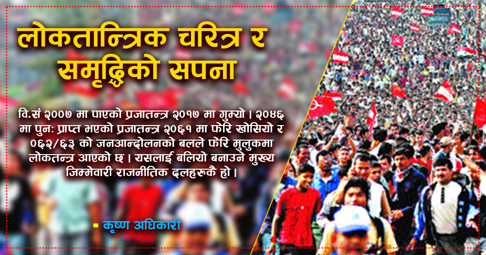 विसं २००७ मा पाएको प्रजातन्त्र २०१७ मा गुम्यो । २०४६ मा पुनः प्राप्त भएको प्रजातन्त्र २०६१ मा फेरि खोसियो र ०६२÷६३ को जनआन्दोलनको बलले फेरि मुलुकमा लोकतन्त्र आएको छ । यसलाई बलियो बनाउने मुख्य जिम्मेवारी राजनीतिक दलहरुकै हो । आन्दोलन गर्ने, उपलब्धि हासिल गर्ने, उपलब्धि गुम्ने, पुनः सङ्घर्ष गर्ने र फेरि उपलब्धि हासिल गर्ने गोलचक्करमै नेपालको लोकतान्त्रिक आन्दोलन फस्दै आएका कारण यसको संस्थागत विकास हुन अझै सकेको छैन । त्यसैले लोकतान्त्रिक यात्रा आरम्भ गरेको झन्डै साढे सात दशक पुग्दै गर्दा आज फेरि त्यसको संस्थागत विकासको आवश्यकता खट्किएको स्वयं नेताहरुका अभिव्यक्तिबाट पुष्टि हुन्छ । अब राजनीतिक आन्दोलन नभएर गरिबीको अवस्था अन्त्यका लागि सबै राजनीतिक शक्तिहरु एकमत हुन आवश्यक छ ।