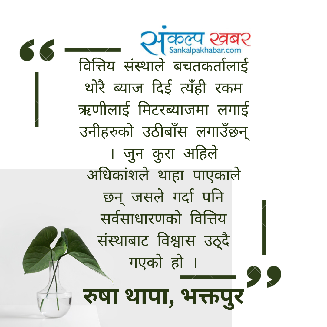 कति खेर र कसरी आफ्नो रकम बैंक तथा सहकारीबाट निकाल्ने ? भनेर सोच्दासोच्दै उनीहरुको भोक र निन्द्रा मेटिसकेको छ । तर, अचम्मको कुरा हो नि है । हामी बचतकर्ताले विश्वास र ब्याजको लोभमा परेर सहकारीमा आफुले जीवनभर कमाएको रकम जम्मा गप्यौँ त सहकारी पनि नाफा कमाउने उद्देश्यले त्यो रकम घरजग्गा, गाडी र सेयरमा लगानी गप्यो ।