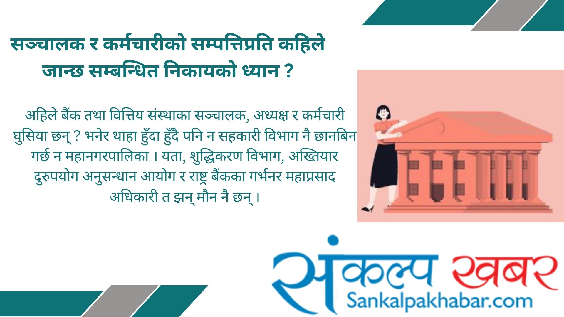 अहिले बैंक तथा वित्तिय संस्थाका सञ्चालक, अध्यक्ष र कर्मचारी घुसिया छन् ? भनेर थाहा हुँदा हुँदै पनि न सहकारी विभाग नै छानबिन गर्छ न महानगरपालिका । यता, शुद्धिकरण विभाग, अख्तियार दुरुपयोग अनुसन्धान आयोग र राष्ट्र बैंकका गर्भनर महाप्रसाद अधिकारी त झन् मौन नै छन् । पछिल्लो समय सबैभन्दा बढी भ्रष्टाचार हुने ठाउँ नै बैंक तथा वित्तिय संस्था हो । संस्थाका सञ्चालक, अध्यक्ष र कर्मचारीहरु मालामाल भएका छन् भने ऋणीको उठीबाँस लगाएका छन् । वित्तिय संस्थाकै कारण करोडौँको धितो भएका करोडपति समेत सुकुम्बासी हुन पुगेका छन् । तर, त्यो ऋण सहन नसकेर कतिपयले आत्महत्या समेत गरेका छन् । बैंक तथा वित्तिय संस्थामा जागिर खाएको दश वर्ष नबित्दै संस्थाका साधारण कर्मचारीले समेत जग्गा किनेर घर बनाउँछन् ।