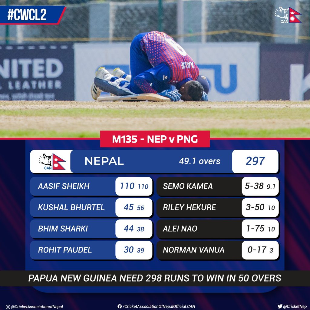 काठमाडौं । ओपनर ब्याटर आसिफ शेखको सानदार शतकमा नेपालले पपुवा न्युगिनीलाई विशाल लक्ष्य दिएको छ। बिहिबार टियु क्रिकेट मैदानमा टस हारेर ब्याटिङ थालेको नेपालले ४९.१ ओभरमा १० विकेट गुमाउँदै २९७ रन बनाएको हो ।