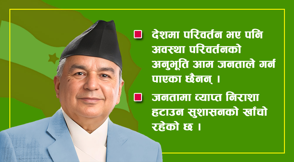 सङ्घीय लोकतान्त्रिक गणतन्त्रको रक्षा गर्दै देशमा सुशासन कायम गर्नु अहिलेको मुख्य चुनौती रहेको छ । देशमा परिवर्तन भए पनि अवस्था परिवर्तनको अनुभूति आम जनताले गर्न पाएका छैनन् । जनतामा व्याप्त निराशा हटाउन सुशासनको खाँचो रहेको छ । देशलाई सुशासन दिएर विकास गरेर युवालाई विदेशिन नपर्ने, रोजगारी सिर्जना गर्नेतर्फ सरकारलाई ध्यानाकर्षण गराउन पनि राष्ट्रपतिले पहल गर्नुपर्ने हुन्छ । देश अहिले गम्भीर अवस्थामा रहेको कारण सबै राजनीतिक दलहरू एक ठाउँमा उभिएर त्यसलाई समाधान गर्नुपर्ने समय भएको छ । अझै पनि देशमा राजनीतिक सङ्कट टरिसकेको छैन, त्यसको निम्ति हरेक मुद्दाहरूमा राष्ट्रिय एकता गरेर जानु पर्नेछ । समयअनुरुप चुनौती बदलिँदै र जटिल बन्दै गएका छन् । अहिलेको प्रणाली र संविधानमाथि विभिन्न कोणबाट देखिएका चुनौती र विचलनको अवस्थाप्रति सजग रही कुनै पनि तलमाथि हुन नदिई प्रभावकारी ढङ्गबाट काम गर्नुपर्ने दायित्वबाट उहाँ विमुख हुनुहुँदैन ।