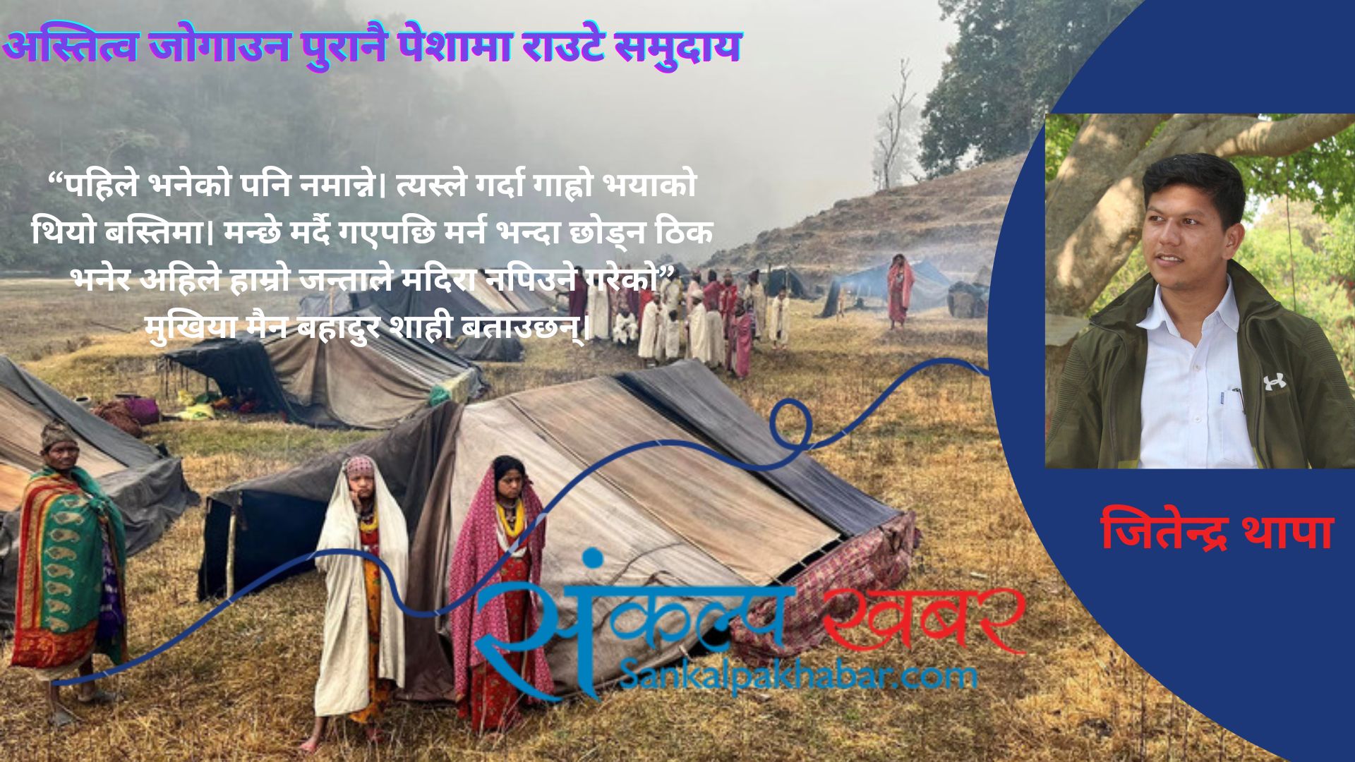 समुदायका केही महिलाहरू घर आँगन सफा गर्दै थिए। कोही अस्थाई घर निर्माण गर्नमा व्यस्त देखिन्थे। अन्य राउटे पुरुषहरू काठका विभिन्न सामाग्री बनाउन तल्लिन देखिन्थे समुदायका राउटे युवा जंगल पुगेर काठ दाउरा बोकेर बस्तिमा पुग्दै भारी बिसाउदै थकान मेट्दै थिए। राउटे युवती भने नजिकैको खोलाको पानी टाउकोमा राखेर बस्तितिर आउदै थिए। दृश्य हो दैलेखको भैरवी गाउँपालिका १ नाभिस्थान।