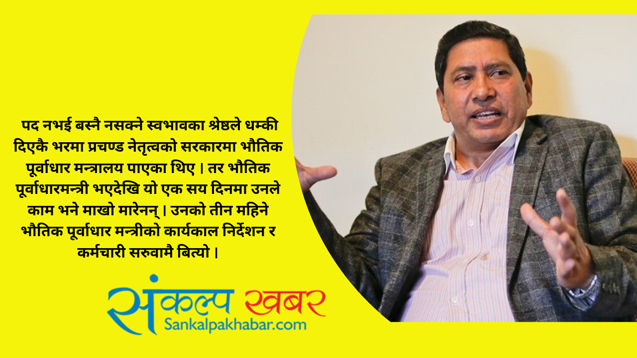 पद नभई बस्नै नसक्ने स्वभावका श्रेष्ठले धम्की दिएकै भरमा प्रचण्ड नेतृत्वको सरकारमा भौतिक पूर्वाधार मन्त्रालय पाएका थिए । तर भौतिक पूर्वाधारमन्त्री भएदेखि यो एक सय दिनमा उनले काम भने माखो मारेनन् । उनको तीन महिने भौतिक पूर्वाधार मन्त्रीको कार्यकाल निर्देशन र कर्मचारी सरुवामै बित्यो ।