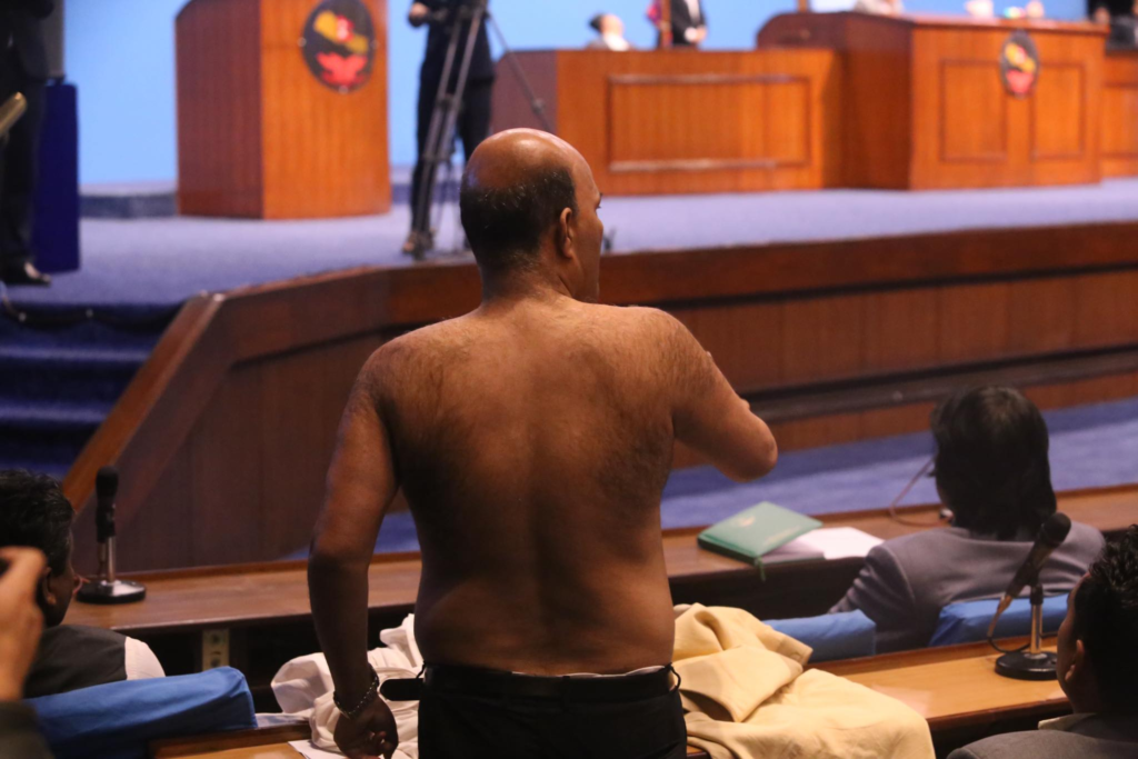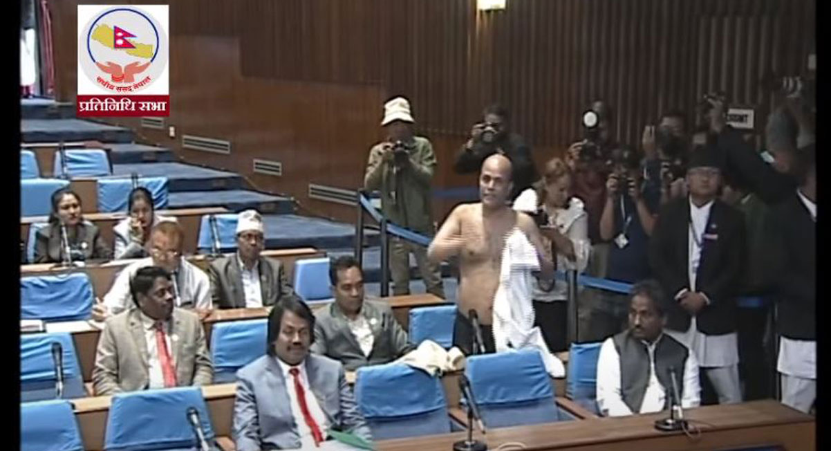 उनले सभ्य नभए नियमानुसार कारबाही गर्ने जानकारी गराए। सांसद अर्धनग्न भएपछि सभामुख घिमिरेले संसदीय मर्यादाको ख्याल गर्न आग्रह गरे। सिंहले उठेर आफूले लगाएको सर्ट र सेण्डो उतारेर अर्धनग्न बनेका थिए।