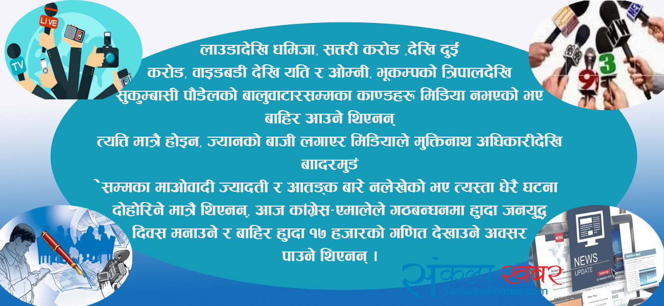 काठमाडौं । लाउडादेखि धमिजा, सत्तरी करोड़देखि दुई करोड़, वाइडबड़ीदेखि यति र ओम्नी, भूकम्पको त्रिपालदेखि सुकुम्बासी पौडेलको बालुवाटारसम्मका काण्डहरू मिडिया नभएको भए बाहिर आउने थिएनन् ।