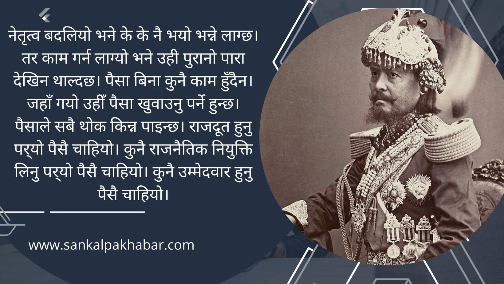 नेतृत्व बदलियो भने के के नै भयो भन्ने लाग्छ। तर काम गर्न लाग्यो भने उही पुरानो पारा देखिन थाल्दछ। पैसा बिना कुनै काम हुँदैन। जहाँ गयो उहीँ पैसा खुवाउनु पर्ने हुन्छ। पैसाले सबै थोक किन्न पाइन्छ। राजदूत हुनु पर्यो पैसै चाहियो। कुनै राजनैतिक नियुक्ति लिनु पर्यो पैसै चाहियो। कुनै उम्मेदवार हुनु पैसै चाहियो।