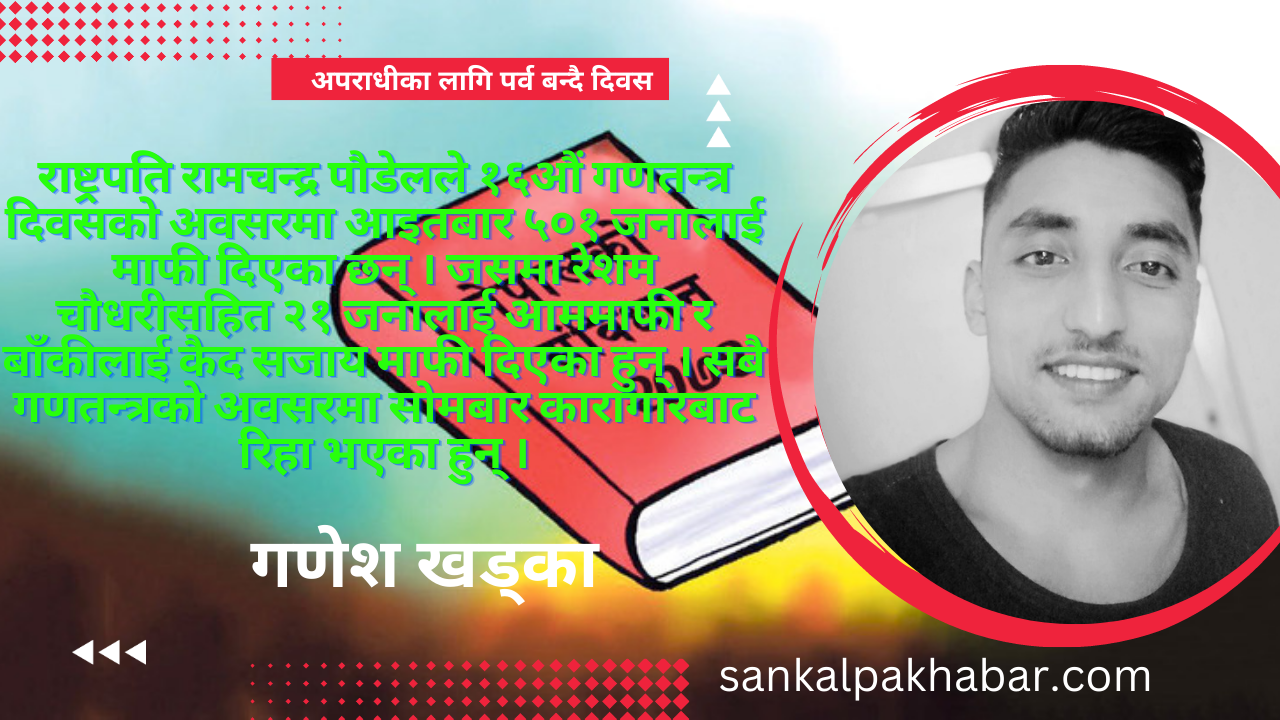 राष्ट्रपति रामचन्द्र पौडेलले १६औं गणतन्त्र दिवसको अवसरमा आइतबार ५०१ जनालाई माफी दिएका छन् । जसमा रेशम चौधरीसहित २१ जनालाई आममाफी र बाँकीलाई कैद सजाय मापी दिएका हुन् । सबै गणतन्त्रको अवसरमा सोमबार कारागारबाट रिहा भएका हुन् ।