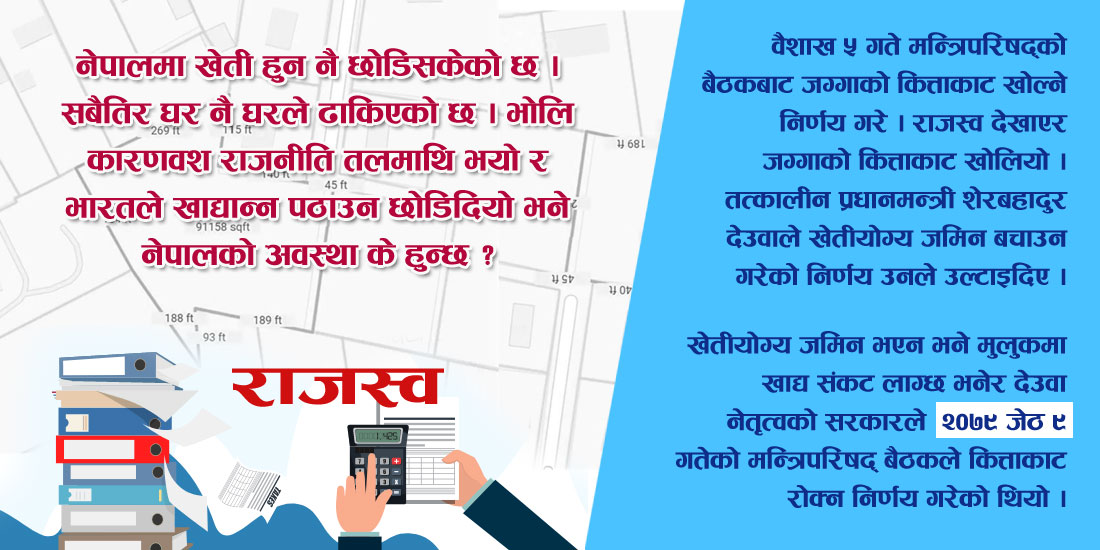 भोलि केही कारणवश भारतले खाद्यान्नको निर्यात रोकिदियो भने नेपाली भोकभोकै मर्छन् भनेर देउवा सरकारले यस्तो निर्णय गरेको हो । खाद्यान्नमा आत्मनिर्भर भयो भने मात्र मुलुक बलियो हुन्छ भन्ने कुरा प्रचण्ड सरकारले बुझेन । हतारोमा कित्ताकाट खोलियो । जग्गाको वर्गीकरण गर्ने भनिएको थियो ।