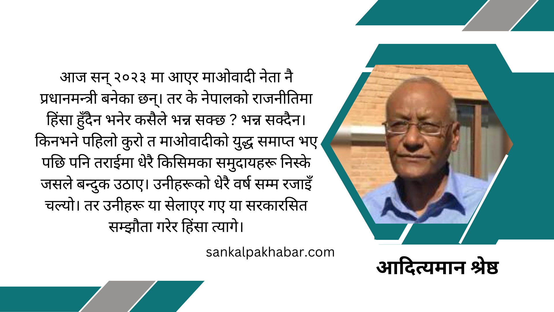 आज भन्दा २०, २१ वर्ष अगाडि नेपालमा कहिले हिंसाको अन्त्य होला भनेर एउटा लेख लेखिएको थियो। त्यस बेला नेपालमा माओवादीको युद्ध चलिरहेको थियो। त्यसै सिलसिलामा लेखिएको थियो कि माओवादीहरूको हिंसाको अन्त भए पनि नेपाली राजनीतिमा हिंसा हत्याको अन्त्य हुने छैन। माओवादीहरू आखिरमा नेपाली कांग्रेसका चेला हुन् किनभने नेपाली कांग्रेसले पनि राणा र राजाको विरोधमा हतियार उठाएका थिए।