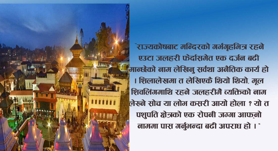 राज्यकोषबाट मन्दिरको गर्भगृहभित्र रहने एउटा जलहरी फ़ेर्दासमेत एक दर्जन बढ़ी मान्छेको नाम लेखिनु सर्वथा अनैतिक कार्य हो । शिलालेखमा त लेखिएकै थियो थियो, मूल शिवलिंगमाथि रहने जलहरीमैं व्यक्तिको नाम लेख्ने सोच या लोभ कसरी आयो होला रु यो त पशुपति क्षेत्रको एक रोपनी जग्गा आफ्नो नाममा पास गर्नुभन्दा बढ़ी अपराध हो ।