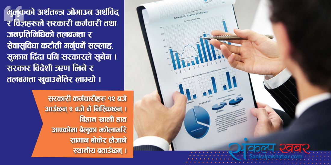 मेयर, उपमेयर, वडाध्यक्षलगायत जनप्रतिनिधिहरू कमाउनै आएका हुन् । मुलुकको अर्थतन्त्र जोगाउन अर्थविद् र विज्ञहरूले सरकारी कर्मचारी तथा जनप्रतिनिधिको तलबभत्ता र सेवासुविधा कटौती गर्नुपर्ने सल्लाह, सुझाव दिँदा पनि सरकारले सुनेन । सरकार विदेशी ऋण लिने र तलबभत्ता खुवाउनेतिर लाग्यो । विभिन्न मुलुकबाट नेपाल नै धितो राखेर नेपाल सरकारले २२ खर्बभन्दा बढी विदेशी ऋण लिइसकेको छ । प्रत्येक नेपालीको टाउकोमा ८० हजारभन्दा बढी विदेशी ऋण पुगिसकेको छ ।