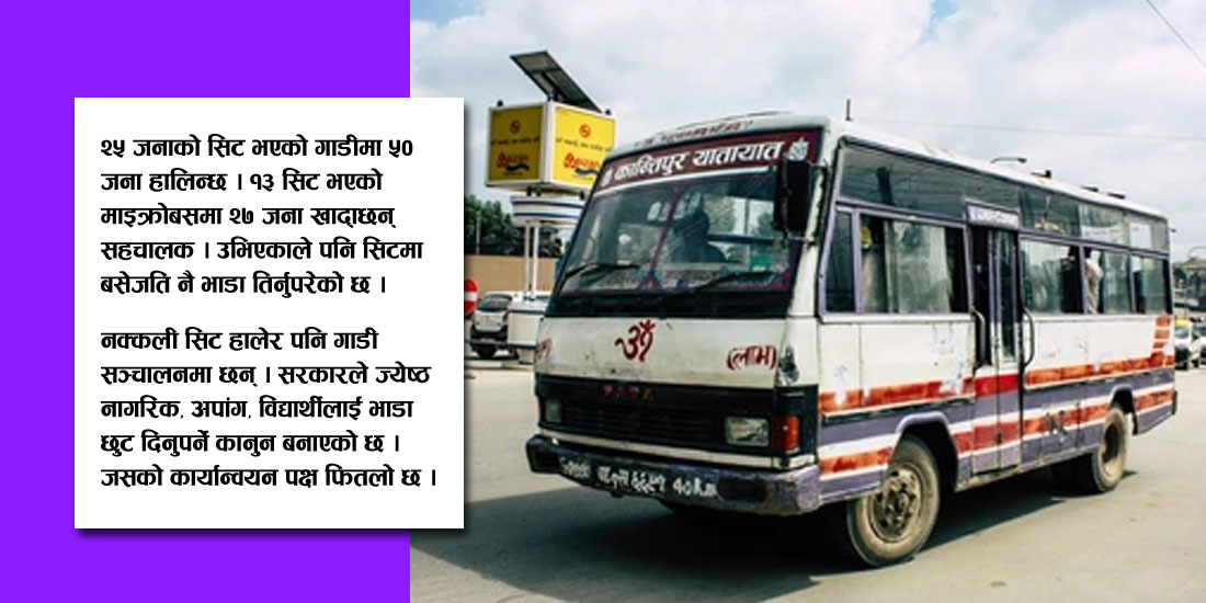 नक्कली सिट हालेर गाडी सञ्चालनमा छन् । सरकारले ज्येष्ठ नागरिक, अपांग, विद्यार्थीलाई भाडा छुट दिनुपर्ने कानुन बनाएको छ । जसको कार्यान्वयन पक्ष फितलो छ । सार्वजनिक यातायातको अवस्था हेर्यो भने कहिले नचढौंजस्तो हुन्छ । सिटको खोलहरू च्यातिएको हुन्छ, त्यो पनि वर्षौंदेखि नधोएको । गाडी मात्रै होइन, सहचालक र चालक पनि फोहोरी हुन्छन् । यात्रुलाई राम्रो बोलीवचन गर्दैनन् । वर्षौं पुराना गाडीहरू सडकमा गुडिरहेका छन् । सिटमा बस्दा कहिलेकाहीँ त लुगा च्यातिन्छ । किला निस्किएको, सिट भाँच्चिएको हुन्छ । झ्यालको सिसा फुटेर भित्रैसम्म पानी पस्छ । गन्हाएर बसिनसक्नु हुन्छ ।