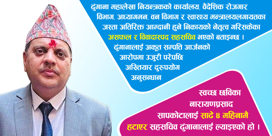 प्रधानमन्त्री पुष्पकमल दाहाल प्रचण्डले आफ्ना निजी सचिव नवराज ढुंगानालाई विभागको महानिर्देशक बनाएपछि व्यापारी र तस्कर उत्साहित बनेको स्रोतले बताएको छ । स्वच्छ छविका नारायणप्रसाद सापकोटालाई साढे चार महिनामै हटाएर सहसचिव ढुंगानालाई ल्याइएको हो । उनी यसअघि जहाँजहाँ पोस्टिङ भएका थिए, ती सबै ठाउँमा उनी विवादित बनेको कर्मचारीहरू बताउँछन् ।
