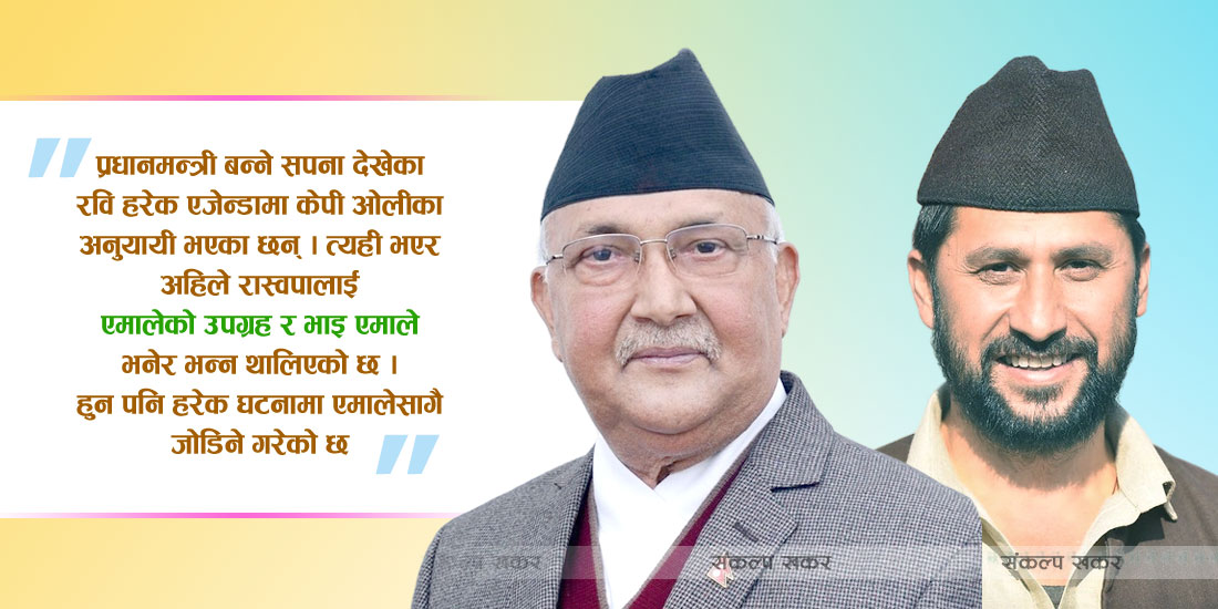 प्रधानमन्त्री बन्ने सपना देखेका रवि हरेक एजेन्डामा केपी ओलीका अनुयायी भएका छन् । त्यही भएर अहिले रास्वपालाई एमालेको उपग्रह र भाइ एमाले भनेर भन्न थालिएको छ । हुन पनि हरेक घटनामा एमालेसँगै जोडिने गरेको छ । मंसिर पछिको निर्वाचनमा केपी ओलीलाई गाली गरे, तर तिनै ओलीले भनेअनुसार गठबन्धनमा बसेर रविले प्रचण्डलाई प्रधानमन्त्री बनाए । आफू उपप्रधानसहित गृहमन्त्री बने । पछि एमालेले प्रचण्डलाई दिएको समर्थन फिर्ता लियो । र, सरकारबाट बाहिरियो ।