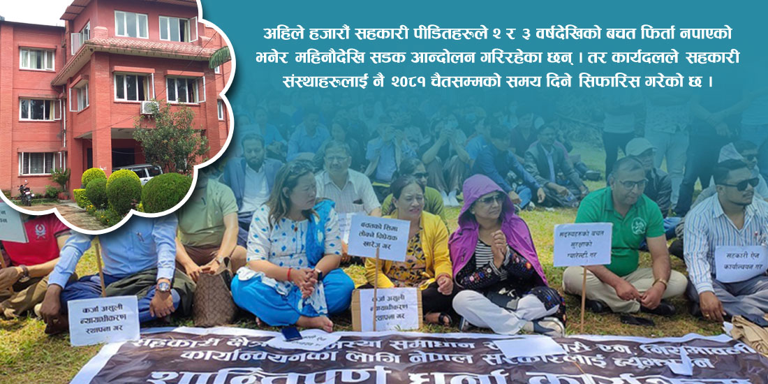 काठमाडौं । सहकारी क्षेत्रका समस्या समाधान गरी बचतकर्ताको रकम फिर्ता गरिदिन उपाय खोज्न भन्दै गठन गरिएको सहकारी क्षेत्र सुधार सुझाव कार्यदलले सहकारी सञ्चालककै हित हुने आशयको प्रतिवेदन प्रधानमन्त्री समक्ष बुझाएको छ। पछिल्लो समय सहकारी क्षेत्रमा देखिएका समस्या समाधानका लागि कार्यदलले २७ बुँदे सुझाव पेस गर्दै प्रारम्भिक प्रतिवेदन बुझाएको हो । तर प्रतिवेदनले जनताको अर्बौं बचत अपचलन गरी फिर्ता नगर्ने सहकारीका सञ्चालकलाई तत्काल कारबाहीको दायरामा ल्याउने सम्बन्धमा भने स्पष्ट र व्यवहारिक सुझाव दिएको छैन। प्रतिवेदन हेर्दा सहकारी पीडित बचतकर्ताहरूको पीडामा सरकारले गठन गरेको सहकारी क्षेत्र सुधार सुझाव कार्यदलले मलम लगाउन सक्ने आधार देखिँदैन।