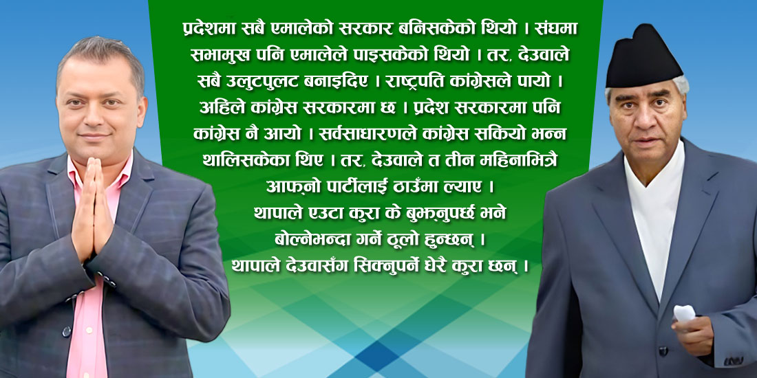 आफ्नो पीडा बिर्सिएर देश बनाउन हिँडेकामाथि अहिले आएर हिलो छ्याप्नु गलत हो । २०७९ मंसिर ४ गतेको चुनावमा सभापति देउवाले पाँच दलसँग गठबन्धन नगरेको भए कांग्रेस सखाप हुन्थ्यो । कांग्रेसलाई १० सीट ल्याउन पनि हम्मेहम्मे थियो । पहिलो पार्टी एमाले नै बन्थ्यो । उनले गठबन्धन गरेर ८९ सीट ल्याए र कांग्रेसलाई पहिलो पार्टी बनाए । सभापति देउवाले बेलैमा दिमाग लगाउँदा मात्रै थापाको जित सम्भव भएको हो ।