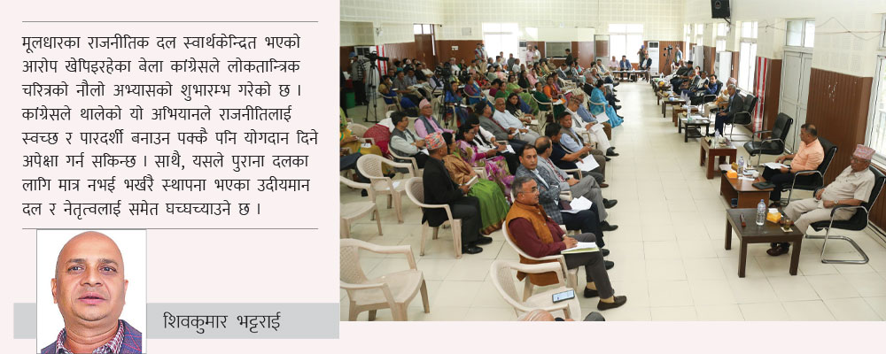 मूलधारका राजनीतिक दल स्वार्थकेन्द्रित भएको आरोप खेपिइरहेका बेला कांग्रेसले लोकतान्त्रिक चरित्रको नौलो अभ्यासको शुभारम्भ गरेको छ। कांग्रेसले थालेको यो अभियानले राजनीतिलाई स्वच्छ र पारदर्शी बनाउन पक्कै पनि योगदान दिने अपेक्षा गर्न सकिन्छ। साथै, यसले पुराना दलका लागि मात्र नभई भर्खरै स्थापना भएका उदीयमान दल र नेतृत्वलाई समेत घच्घच्याउने छ। खास गरी नयाँ राजनीतिक शक्तिका रूपमा देखापरेका दललाई कांग्रेसले थालेको अभ्यास पछ्याउन उत्साहित गर्ने छ। अहिलेसम्म सबै राजनीतिक दलका काम गर्ने शैली र तौरतरिका परम्परागत र कर्मकाण्डी नै छन्। कांग्रेसले थालेको यस्तो अभ्यासले दलको उच्च तहमा हुने छलफल र बहस नागरिक तहमा खुला गरिएको यो नौलो परिघटना पनि हो। यसले राजनीतिक दलको आन्तरिक लोकतन्त्रको अवस्था र स्थिति मापन गर्नसमेत सघाउ पुग्ने छ। पछिल्ला दिन मूलधारका र पुराना दल जनताबाट टाढिने गरेको वा जनताप्रति अनुत्तरदायी हुन थालेको आरोप लाग्ने गरेको छ। यस्तो आरोप चिर्नसमेत कांग्रेसको पछिल्लो निर्णय गतिलो जवाफ हुन सक्छ।
