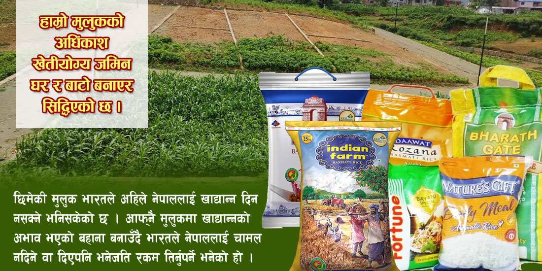 छिमेकी मुलुक भारतले अहिले नेपाललाई खाद्यान्न दिन नसक्ने भनिसकेको छ । आफ्नै मुलुकमा खाद्यान्नको अभाव भएको बहाना बनाउँदै भारतले नेपाललाई चामल नदिने वा दिएपनि भनेजति रकम तिर्नुपर्ने भनेको हो । हाम्रो मुलुकको अधिंकाश खेतीयोग्य जमिन घर र बाटो बनाएर सिद्धिएको छ । मुलुकभरका ९० प्रतिशत खेतीयोग्य जमिन मासिसक्दा जसोतसो १० प्रतिशत बचेको छ । नेपालमा सात दशकअघि ९३ लाख जनसंख्या थियो । जताततै खेतीयोग्य जमिन थियो । तर, अहिले ९३ लाखबाट जनसंख्या तीन करोड पुगेको छ । ६ दशकअघि नेपालको भूमि धेरै थियो ।