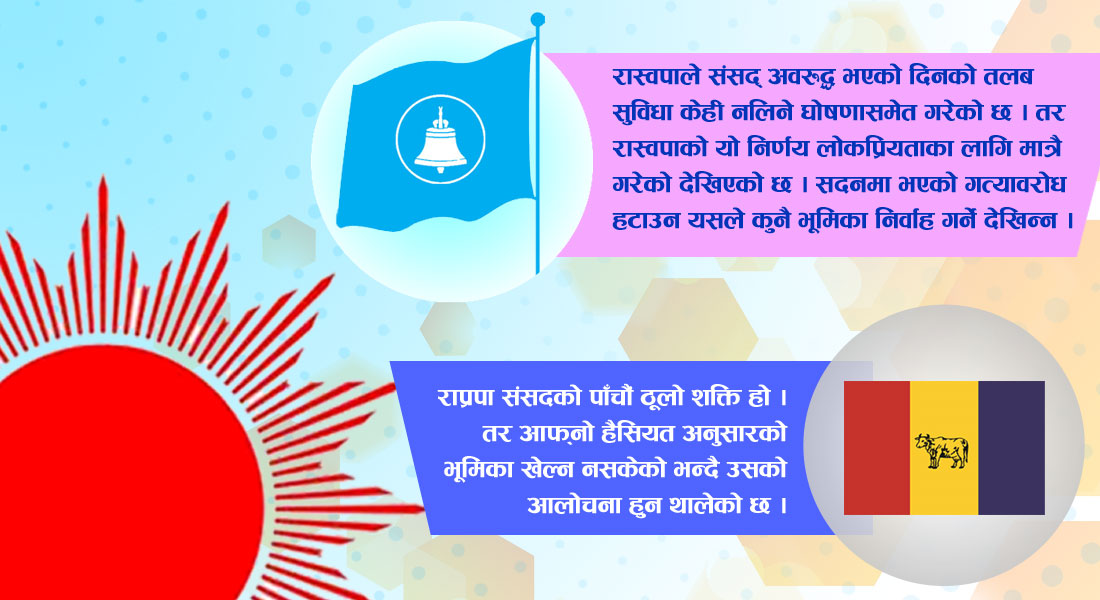 तर २०४८ सालदेखि नै संसदमा रहँदै आएको राप्रपाले भने रास्वपा जतिको भूमिका पनि निर्वाह गर्न सकेको छैन । राजेन्द्र लिङ्देन नेतृत्वको राप्रपालाई हिन्दु राष्ट्र र राजालाई पुनःस्थापना गर्ने कार्यक्रम गर्दैमा फुर्सद छैन । सदन र सडकमा राप्रपाले जनजीविकाका सवाल उठाउन चुकेको छ । उसको एक मात्र रटान हिन्दु राष्ट्र र राजा पुनःस्थापना हुनुपर्ने देखिन्छ । राप्रपा संसदको पाँचौं ठूलो शक्ति हो । तर आफ्नो हैसियतअनुसारको भूमिका खेल्न नसकेको भन्दै उसको आलोचना हुन थालेको छ ।