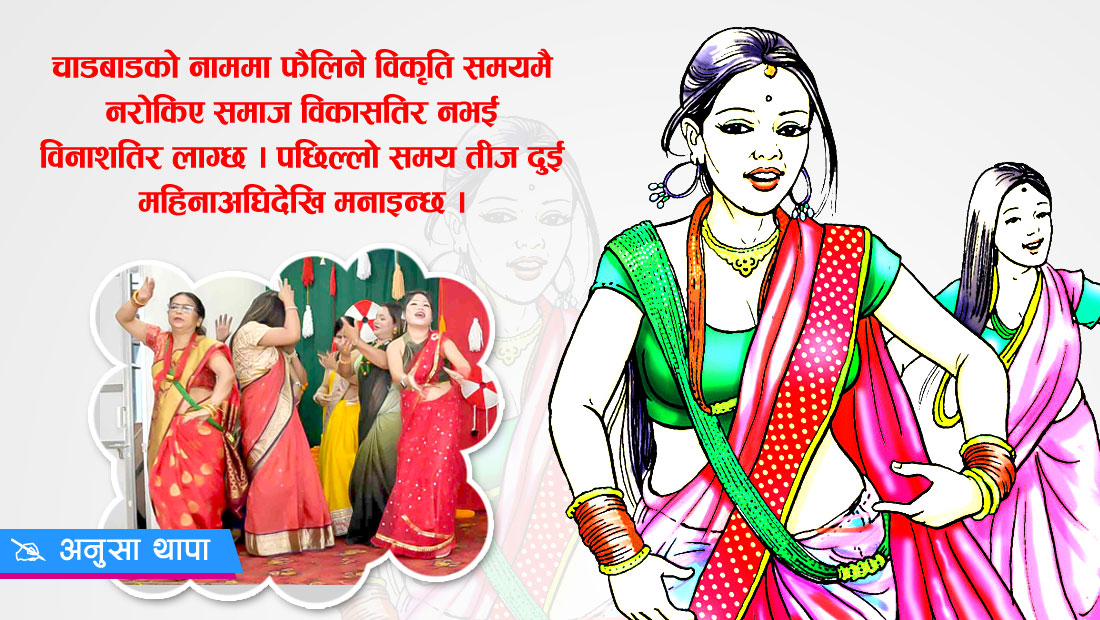 अहिले चाडबाडको नाममा विकृति फैलाउने काम भइरहेको छ । महिला तथा युवतीहरू समाज भड्काउने कपडा लगाउने गर्छन् । अब सरकारले यस्ता गतिविधि रोक्न कानुन बनाउन आवश्यक परिसकेको छ । अहिले गरिब जुनसुकै चाडबाड भए पनि भोकै सुत्न बाध्य भएका छन् । धनीहरू लाखौं रुपैयाँ खर्च गरेर चाडवाड मनाउँछन् । गरिब त्यो देखेर चोरी, लुटपाटमा संलग्न हुन्छन् । चाडबाडको नाममा फैलिने विकृति समयमै नरोकिए समाज विकासतिर नभई विनाशतिर लाग्छ । पछिल्लो समय तीज दुई महिनाअघिदेखि मनाइन्छ । लाखौं रुपैयाँ खर्च गरिन्छ । तर, गरिब जनता बेरोजगारी र महँगीका कारण भोकभोकै सुतेका छन् । शिक्षा र स्वास्थ्यबाट वञ्चित भएका छन् ।