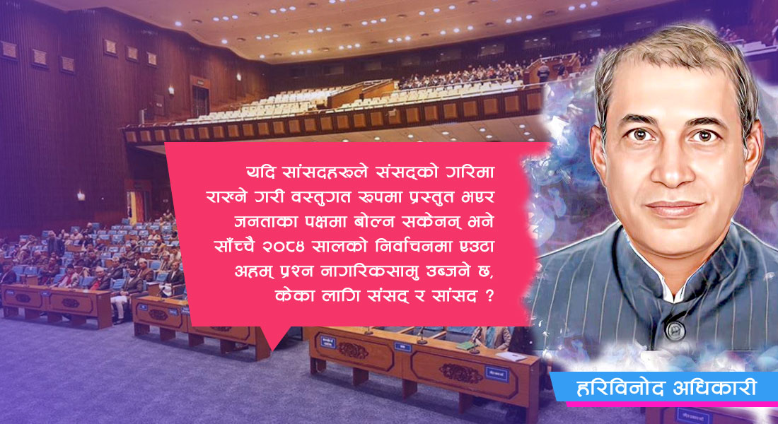 हामीसँग अहिले संसद् र सांसदहरूको संख्याभन्दा गुणात्मक रूपमा संसद्प्रति र जनताप्रति कति सांसदहरू उत्तरदायी छन् भन्ने प्रश्न नागरिक तहमै उठ्न थालेको छ । अहिलेदेखि नै २०८४ सालको निर्वाचनका बारेमा एकले अर्कालाई देखाउने होडबाजी सुरु भएको छ । तर राजनीतिक पर्यवेक्षकहरू ठान्दछन्, यदि सांसदहरूले संसद्को गरिमा राख्ने गरी वस्तुगत रूपमा प्रस्तुत भएर जनताका पक्षमा बोल्न सकेनन् भने साँच्चै २०८४ सालको निर्वाचनमा एउटा अहम् प्रश्न नागरिकसामु उब्जने छ, केका लागि संसद् र सांसद ? लोकतन्त्रको तीन दशकदेखिको यात्रामा अझै देखिएको अपरिपक्वताले मुलुकको अवस्थालाई अझै अस्थिर राजनीतिक यात्रामा धकेल्ने हो कि भन्ने शंका उत्पन्न हुनु स्वाभाविकै हो ।