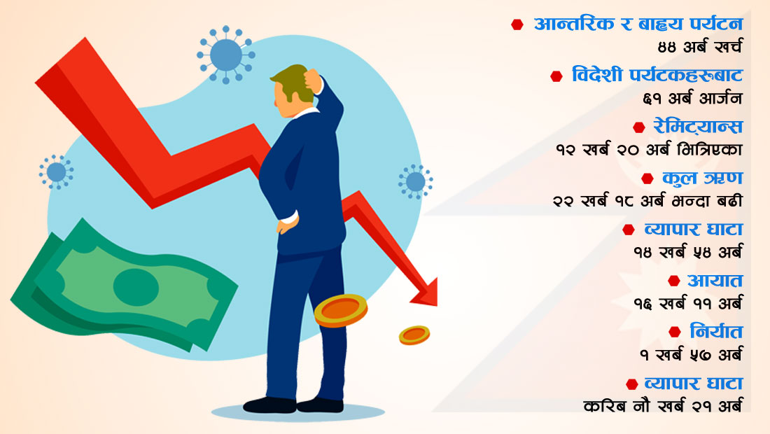 नेपालले वैदेशिक व्यापारका क्रममा पनि घाटा नै बेहोरेको छ । बैंकहरूको खराब कर्जा बढिरहेको छ । खराब कर्जा नियन्त्रण विभिन्न बैंक सीमाबाहिर गएर खराब कर्जालाई असल कर्जामा परिणत गर्नतिर लागेका छन् । अहिले कोभिडबाट खस्केको पर्यटन उद्योग र नेपालको अर्थतन्त्र सुधारका लागि आन्तरिक पर्यटन व्यावसाय फस्टाउँदै गएको छ । आन्तरिक र बाह्य पर्यटनके क्रममा नेपालीहरूले लगभग ४४ अर्ब रुपैयाँ खर्च गरेका छन् । यस वर्ष नेपाल भ्रमणका लागि नेपाल भित्रिएका आठ लाख ६२ हजार विदेशी पर्यटकहरूबाट नेपालले ६१ अर्ब रुपैयाँ आर्जन गरेको छ । यो तथ्यांकलाई आधार मानेर हेर्ने हो भने अध्ययनका लागि विदेश जाने नेपाली विद्यार्थीहरूले बढी रकम खर्चेका छन् ।