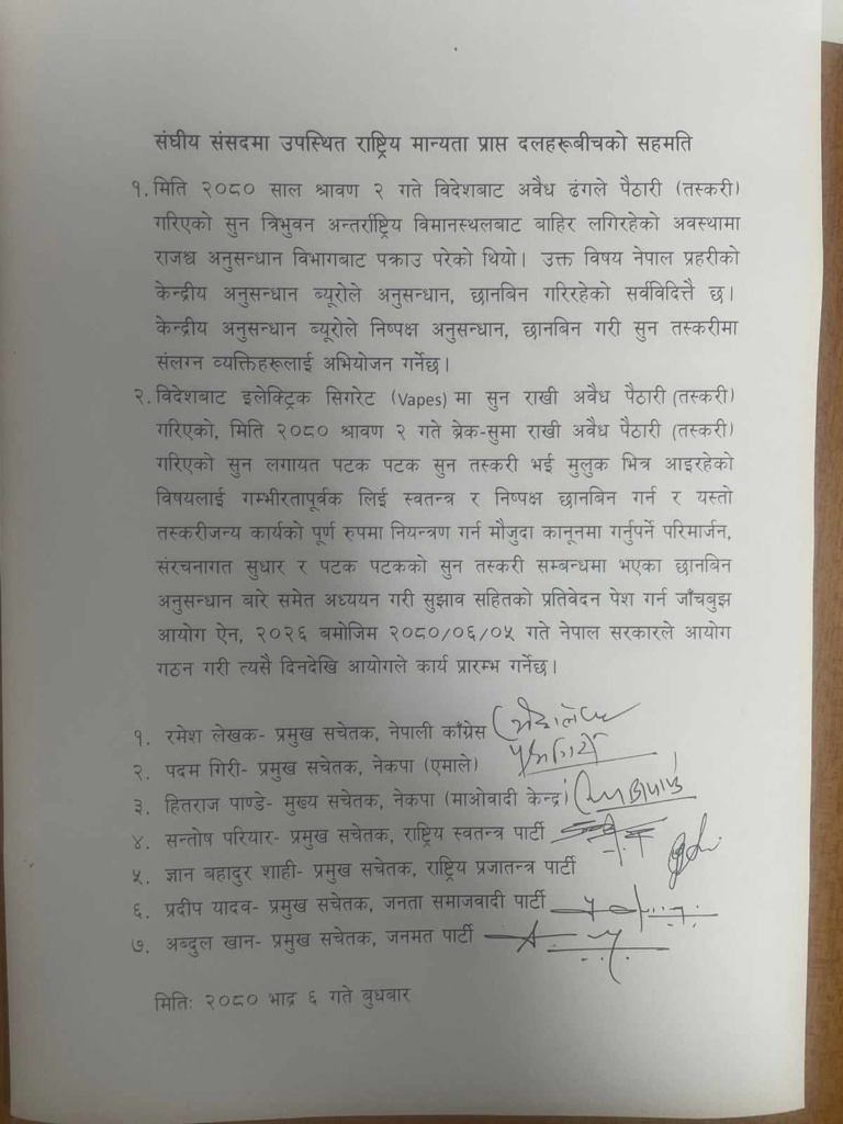 ‘विदेशबाट इलेक्ट्रिक सिगरेटमा सुन राखी अवैध पैठारी (तस्करी) गरिएको, मिति २०८० श्रावण २ गते ब्रेक सुमा राखी अवैध पैठारी (तस्करी) गरिएको सुन लगायत पटक पटक सुन तस्करी भई मुलुक भित्र आइरहेको विषयलाई गम्भीरतापूर्वक लिई स्वतन्त्र र निष्पक्ष छानबिन गर्न र यस्तो तस्करीजन्य कार्यको पूर्ण रुपमा नियन्त्रण गर्न मौजुदा कानूनमा गर्नुपर्ने परिमार्जन, संरचनागत सुधार र पटक पटकको सुन तस्करी सम्बन्धमा भएका छानबिन अनुसन्धानबारे समेत अध्ययन गरी सुझाव सहितको प्रतिवेदन पेश गर्न जाँचबुझ आयोग ऐन, २०२६ बमोजिम असोज ६ गते नेपाल सरकारले आयोग गठन गरी त्यसै दिनदेखि आयोगले कार्य प्रारम्भ गर्नेछ’, सहमतिपत्रमा भनिएको छ ।