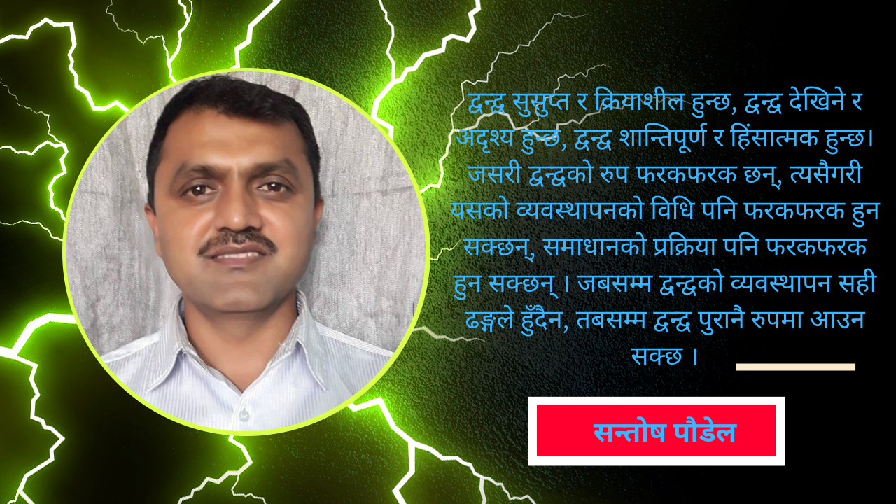 त्यसैले द्वन्द्व व्यवस्थापनमा राज्यमात्रै नभई नागरिक समाज र समाजका हरेक व्यक्तिको उत्तिकै भूमिका हुन आउँछ । पीडितहरुलाई समाजमा तिरस्कार होइन, सम्मान र हौसला प्रदान गर्न सक्नुपर्दछ । समाज सबैको हो, समाज सबैका लागि हो भन्ने मान्यताको विकास गरेर मात्रै सबै प्रकारका द्वन्द्वलाई पूर्णरुपमा शान्तिमा रुपान्तरण गर्न सकिन्छ । (लेखक प्रेस सेन्टर नेपालका महासचिव हुनुहुन्छ)