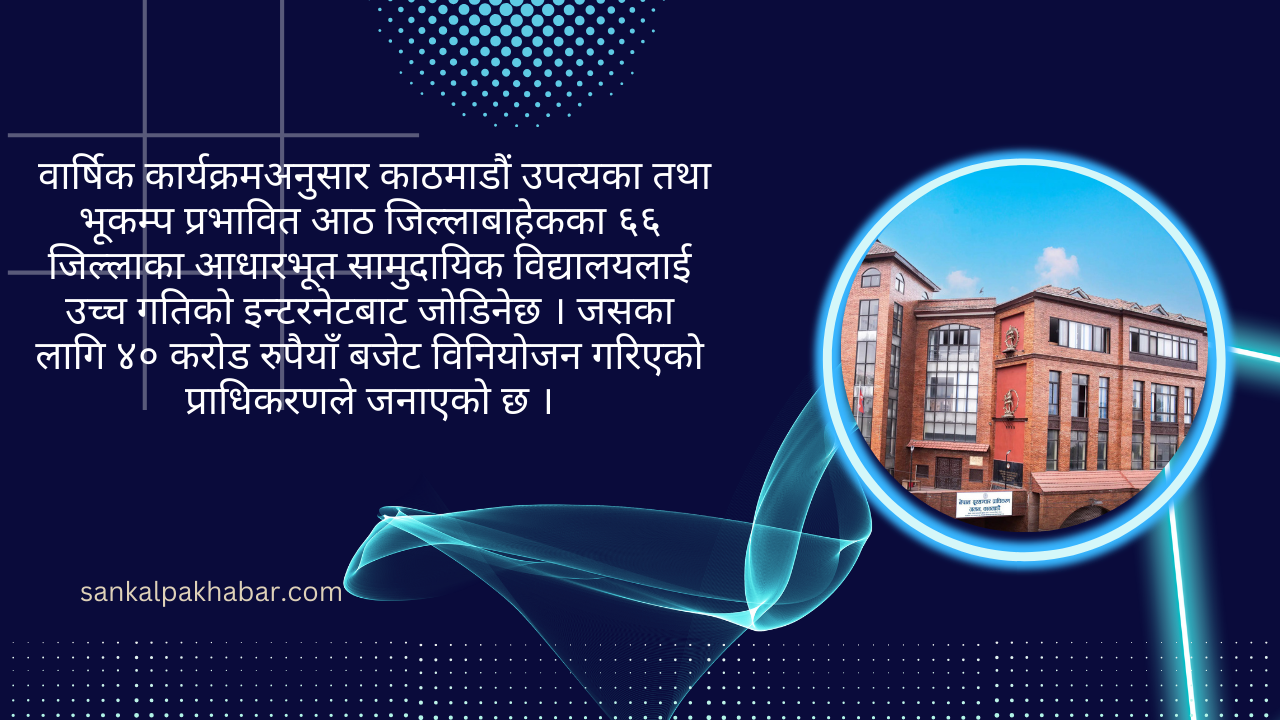 वार्षिक कार्यक्रमअनुसार काठमाडौं उपत्यका तथा भूकम्प प्रभावित आठ जिल्लाबाहेकका ६६ जिल्लाका आधारभूत सामुदायिक विद्यालयलाई उच्च गतिको इन्टरनेटबाट जोडिनेछ । जसका लागि ४० करोड रुपैयाँ बजेट विनियोजन गरिएको प्राधिकरणले जनाएको छ ।