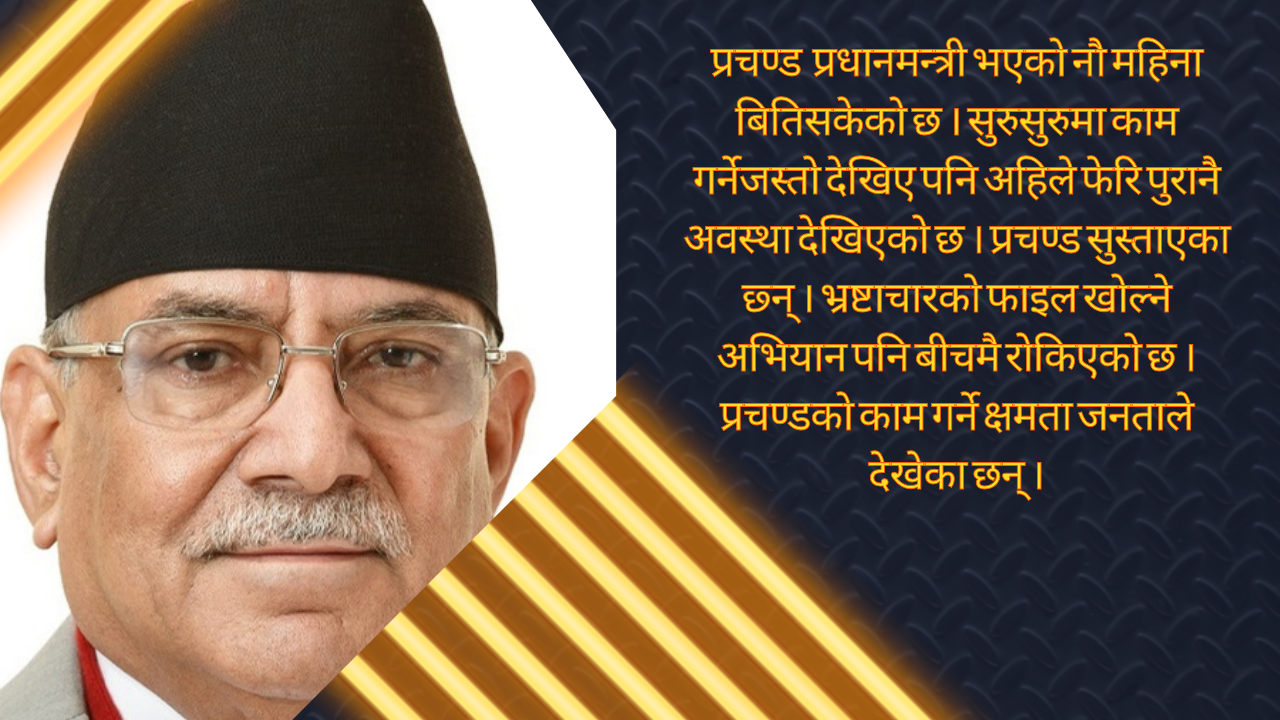 प्रचण्ड प्रधानमन्त्री भएको नौ महिना बितिसकेको छ । सुरुसुरुमा काम गर्नेजस्तो देखिए पनि अहिले फेरि पुरानै अवस्था देखिएको छ । प्रचण्ड सुस्ताएका छ्न् । भ्रष्टाचारको फाइल खोल्ने अभियान पनि बीचमै रोकिएको छ । प्रचण्डको काम गर्ने क्षमता जनताले देखेका छन् । दुईचोटि प्रधानमन्त्री हुँदा त कुनै परिवर्तन ल्याउन नसकेका उनलाई जनताले पत्याउन छाडेका छन् ।