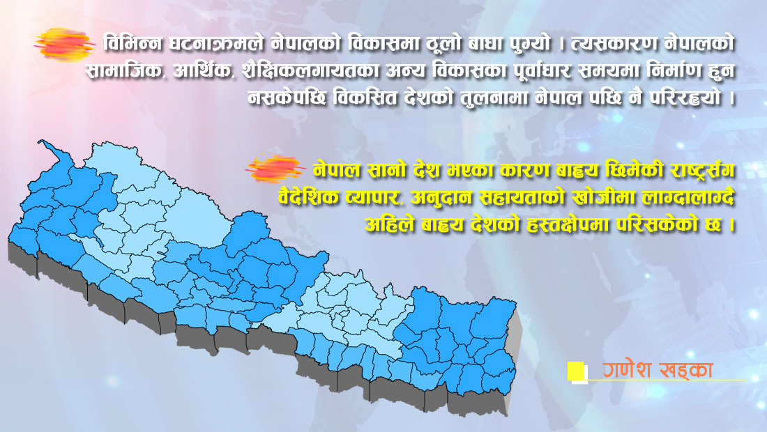 विभिन्न घटनाक्रमले नेपालको विकासमा ठूलो बाधा पुग्यो । त्यसकारण नेपालको सामाजिक, आर्थिक, शैक्षिकलगायतका अन्य विकासका पूर्वाधार समयमा निर्माण हुन नसकेपछि विकसित देशको तुलनामा नेपाल पछि नै परिरह्यो । नेपाल सानो देश भएका कारण बाह्य छिमेकी राष्ट्रसँग वैदेशिक व्यापार, अनुदान सहायताको खोजीमा लाग्दालाग्दै अहिले बाह्य देशको हस्तक्षेपमा परिसकेको छ । देशमा राजनीतिक दलहरूको बहुमत नभएको र दलहरूबीच बढेको असन्तुष्टि, आन्तरिक र बाह्य द्वन्द्वका कारण शक्तिशाली देशहरूले नेपालको मनोविज्ञान बुझेर विदेशी एजेन्डाहरू नेपालमा लागू गर्न दबाब दिन थालेका छन् ।