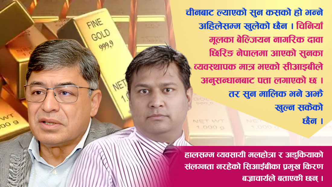 अहिले पनि सिआईबीले विभिन्न व्यक्तिहरूमाथि अनुसन्धान गरिरहेको छ । तर, यसमा हालसम्म व्यवसायी मलहोत्रा र अडुकियाको संलग्नता नरहेको सिआईबीका प्रमुख किरण बज्राचार्यले बताएकी छन् । उनका अनुसार सुन प्रकरणमा सातवटा कम्पनी खडा गरेर सुन ल्याउने गरेको खुलेको छ ।