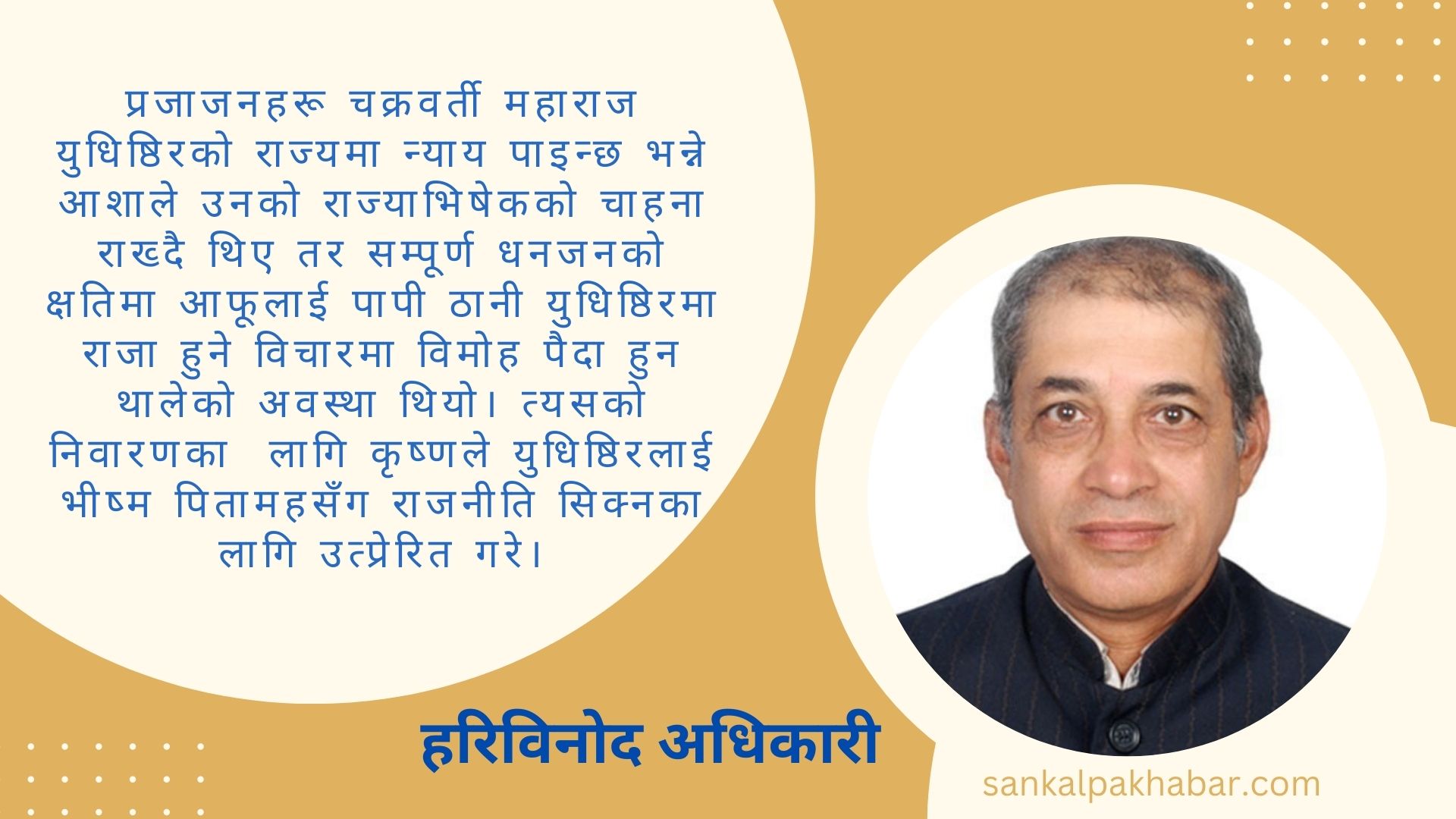महाभारतको शान्तिपर्वमा भीष्म पितामह र युधिष्ठिर संवादलाई संसारमा नै राजनीतिको दिग्दर्शन मानिन्छ। आजभन्दा ५ हजार वर्षभन्दा पहिलेको राजनीतिक परिवेशलाई आजको आँखाबाट हेर्दा पनि समसामयिक परिवेशसँग पनि जोड्न मिल्ने रहेछ। त्यहाँ भनिने प्रसङ्गलाई विवेचना गर्ने हो भने आज पनि राजाको या सत्ताका शीर्ष र कार्यकारी पदमा बस्नेहरूका लागि मार्गदर्शनका रूपमा लिन सकिन्छ।