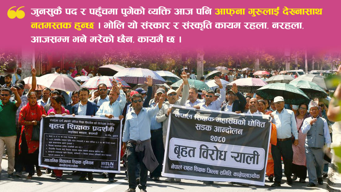 लोकतन्त्रमा विरोधको अधिकार हरेक नागरिकलाई हुन्छ । हरेक पेसाकर्मीलाई पनि छ तर विरोधको स्वरूप शान्तिपूर्ण हुनु पर्छ । अर्को नागरिकको अधिकार हनन नहुने गरी गरिनु पर्छ । अझ आफ्नो पेसा र व्यवसायको मर्यादालाई ख्याल गरेर गरिनु पर्छ । उनीहरूकै अनुसार राज्यबाट शिक्षक अपमानित भएका हुँदा हुन् तर समाजले शिक्षक पेसालाई सम्मानजनक रूपमा लिएको छ । जुनसुकै पद र पहुँचमा पुगेको व्यक्ति आज पनि आफ्ना गुरुलाई देख्नासाथ नतमस्तक हुन्छ । भोलि यो संस्कार र संस्कृति कायम रहला, नरहला, आजसम्म भने मरेको छैन, कायमै छ ।