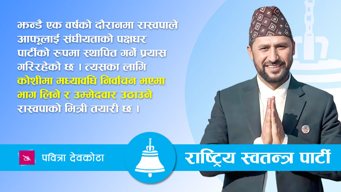 मध्यावधि निर्वाचनलाई ध्यान दिँदै रास्वपाले पार्टीको सम्पूर्ण तागत अहिले कोशीका विभिन्न जिल्लामा लगाएको छ । पार्टी सभापति लामिछानेदेखि महासचिव मुकुल ढकाल, केन्द्रीय सदस्य विराजभक्त श्रेष्ठ, निशा डाँगीलगायत सबै कोशीका इलाम, ताप्लेजुङ, पाँचथरलगायतका जिल्ला पुगेर कार्यक्रम गरिरहेका छन् ।