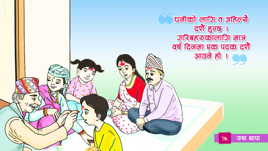 काठमाडौं । दशैं नेपालीको लागि ठूलो चाड हो । तर, यो चाड पनि धनीलाई मात्र लाग्ने गरेको छ । आर्थिक अवस्था कमजोर भएका व्यक्तिहरूले दशैंमा समेत न नयाँ कपडा किन्न पाउँछन्, न मिठो नै खान पाउँछन् । धनीका लागि त जहिल्यै दशैं हुन्छ । गरिबहरूका लागि मात्र वर्ष दिनमा एकपटक दशैं आउने हो । तर, वर्ष दिनमा मनाइने उक्त चाडमा पनि उनीहरूले न राम्रो कपडा लगाउन पाउँछन्, न मिठो खान पाउँछन् । यसपालिको दशैं आँगनमै आइसकेको छ । महँगीले सीमा नाघिसकेको छ । बेरोजगारी ह्वात्तै बढेको छ । व्यापार व्यवसाय ठप्प छ । जताततै आर्थिक मन्दी छ । दशैं भित्रिए पनि बजारमा चहलपहल छैन ।
