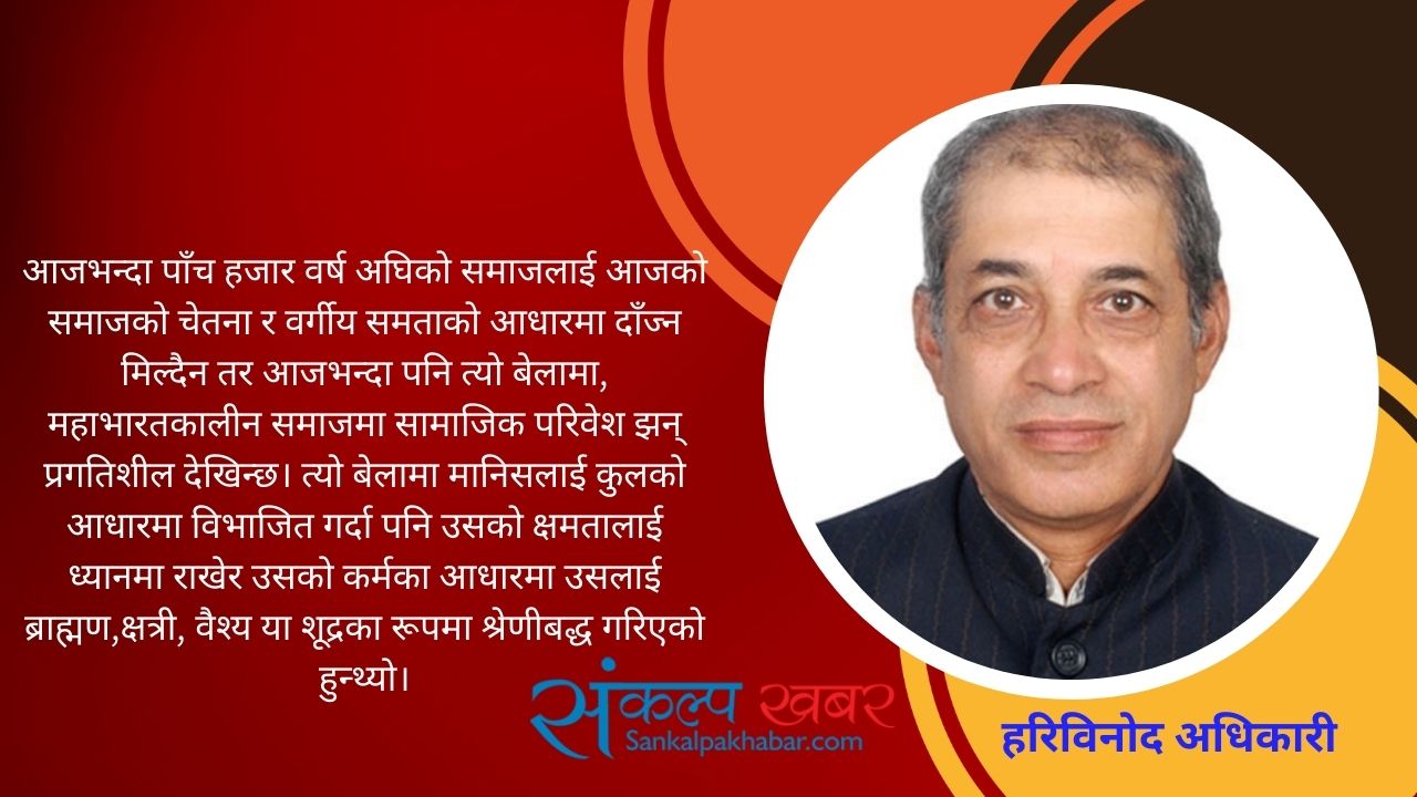 आजभन्दा पाँच हजार वर्ष अघिको समाजलाई आजको समाजको चेतना र वर्गीय समताको आधारमा दाँज्न मिल्दैन तर आजभन्दा पनि त्यो बेलामा, महाभारतकालीन समाजमा सामाजिक परिवेश झन् प्रगतिशील देखिन्छ। त्यो बेलामा मानिसलाई कुलको आधारमा विभाजित गर्दा पनि उसको क्षमतालाई ध्यानमा राखेर उसको कर्मका आधारमा उसलाई ब्राह्मण,क्षत्री, वैश्य या शूद्रका रूपमा श्रेणीबद्ध गरिएको हुन्थ्यो। राजा हरिश्चन्द्रले जब चाण्डाल गर्ने कामको जिम्मा पाएका थिए, त्यो बेलामा उनको गणना चाण्डालको रूपमा भएको थियो।