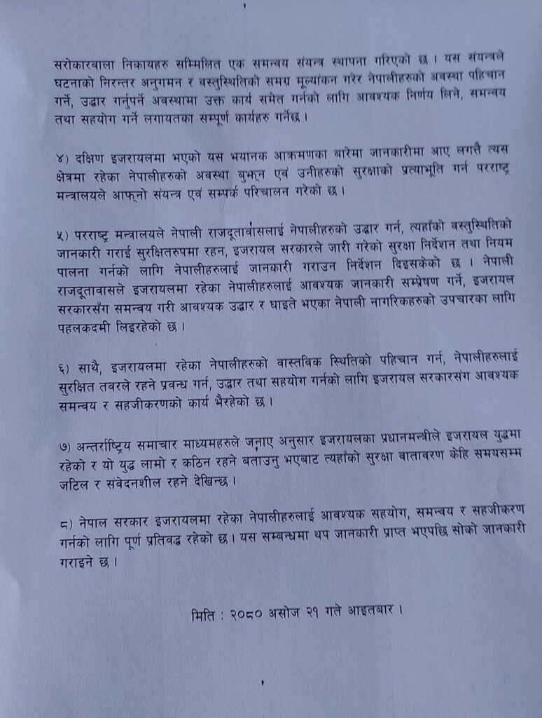 इजराइलमा भएको यस घटनालाई नेपाल सरकारले गम्भीरताका साथ लिएको पनि उनले संसद्मा बताए। आज बिहान प्रधानमन्त्री पुष्पकमल दाहाल ‘प्रचण्ड’ले बैठक बोलाएर परराष्ट्रमन्त्रीको संयोजकत्वमा सबै सरोकारवाला निकाय रहनेगरी समन्वय समिति गठन गरेका छन् । उक्त समितिले घटनाको वस्तुस्थिति बुझ्ने र घटनाको समग्र मूल्यांकन गरेर इजराइलमा रहेका नेपालीहरुको अवस्था पहिचान गर्ने र उद्धार गर्नुपर्ने अवस्थाका लागि समेत कार्यादेश पाएको पनि मन्त्री साउदले बताए ।