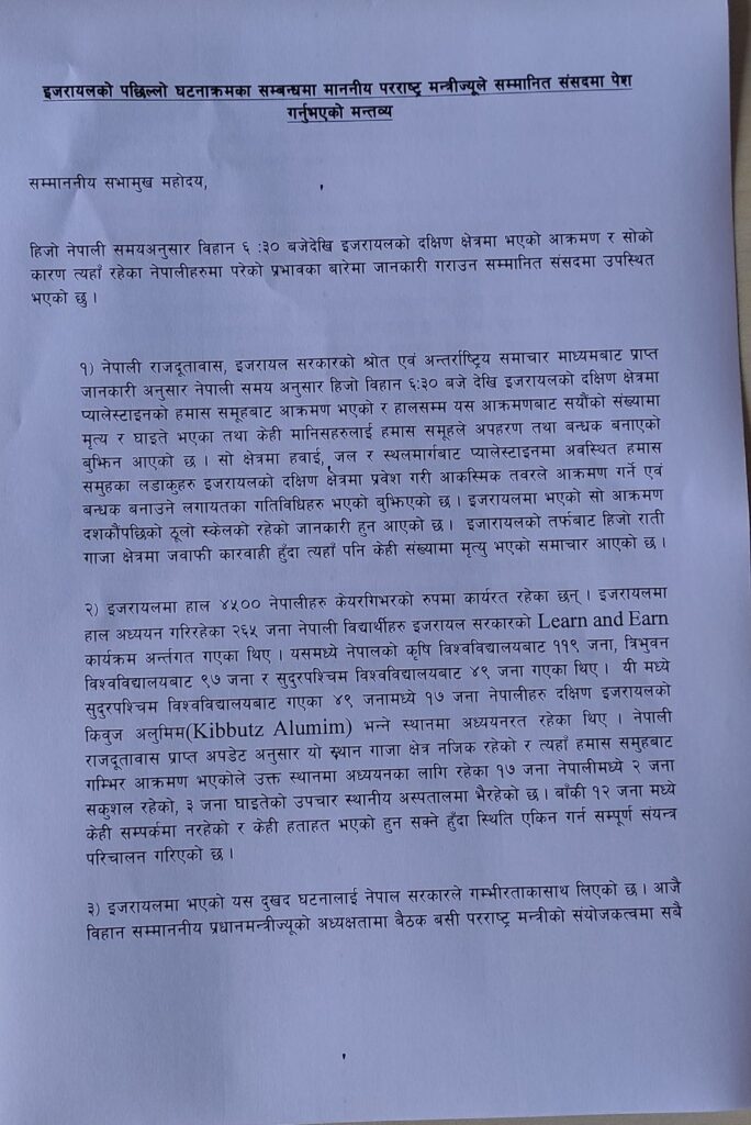 नेपाली समयअनुसार शनिबार बिहान ६ः३० बजेबाट प्यालेस्टाइनी लडाकु समूह हमासले इजराइलको दक्षिण क्षेत्रमा आक्रमण गरेको थियो । उक्त आक्रमणमा परेका नेपालीको अवस्था र नेपालले गरिरहेको पहलका बारेमा परराष्ट्रमन्त्री साउदले प्रतिनिधिसभालाई जानकारी गराएका हुन् ।