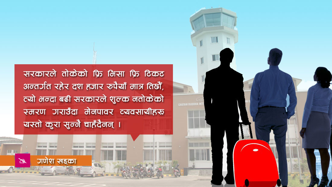 मन्त्रालयले मलेसिया र खाडीका ६ मुलुक साउदी अरब, कतार, युएई, कुवेत, बहराइन र ओमनका लागि दुईतर्फी हवाई टिकट र भिसा निःशुल्क हुनुपर्ने निर्णय गरेको थियो । अन्तर्राष्ट्रिय श्रम संगठनले कामदार भर्ना कामदारसँग शुल्क लिन नपाइने जनाएको छ । व्यवसायी र दलालले निर्णयको फ्रि टिकट र भिसा निर्णयको विरोध गर्दै आएका छन् । विभागले म्यानपावर कम्पनीलाई सेवा शुल्क रोजगारदाता कम्पनीले दिनुपर्ने र नदिएको लिखित जानकारी भए बढीमा १० हजार रुपैयाँसम्म त्यसका लागि कामदारसँग उठाउन स्वीकृति दिने भनेको थियो । कामदार वैदेशिक रोजगारमा जाँदा स्वास्थ्य जाँच, अभिमुखीकरण तालिम, बिमा र कल्याण कोषमा भने आफैंले खर्च बेहोर्नुपर्ने जनाएको थियो ।