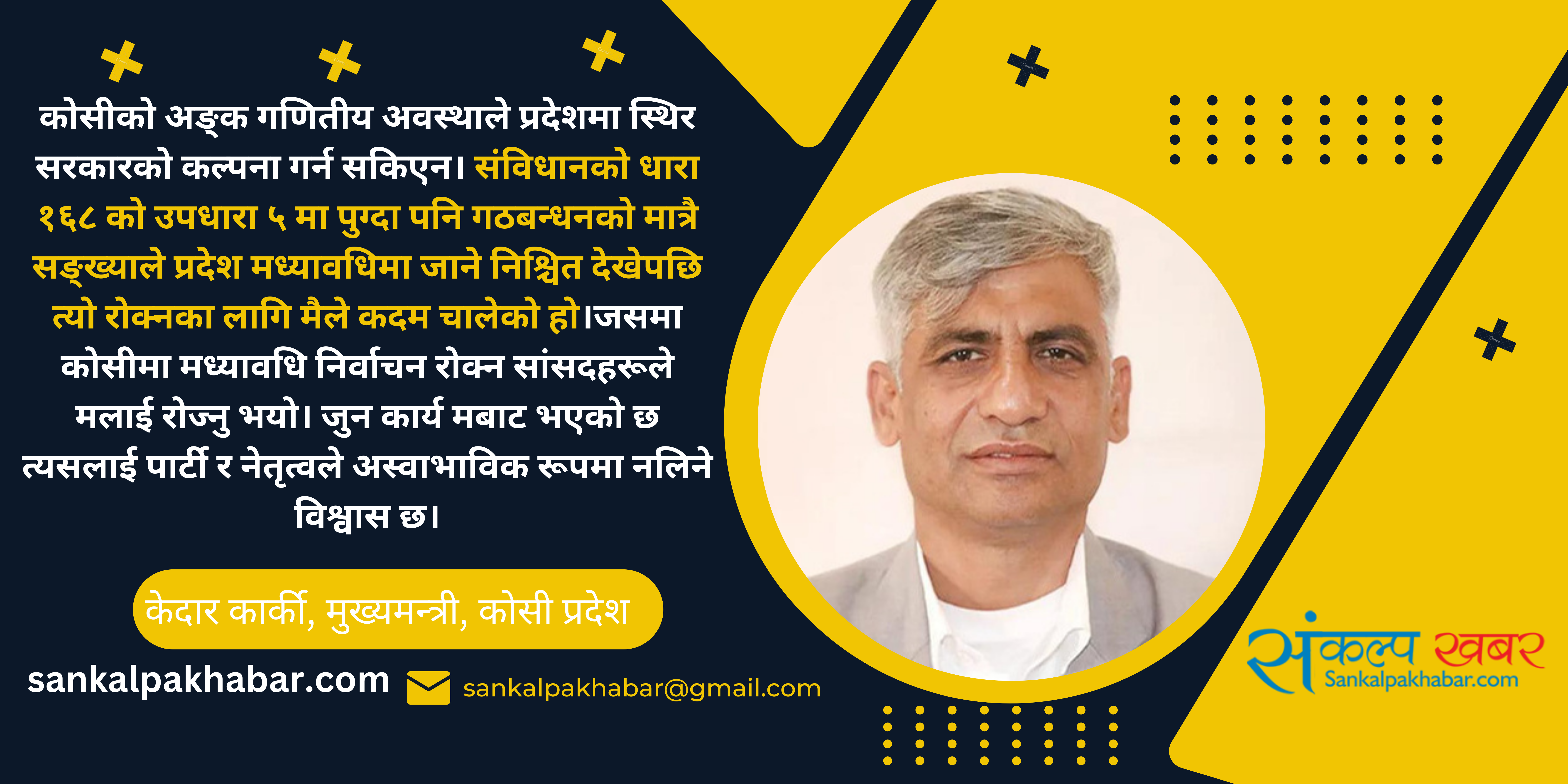 –कोसीको अङ्क गणितीय अवस्थाले प्रदेशमा स्थिर सरकारको कल्पना गर्न सकिएन। संविधानको धारा १६८ को उपधारा ५ मा पुग्दा पनि गठबन्धनको मात्रै सङ्ख्याले प्रदेश मध्यावधिमा जाने निश्चित देखेपछि त्यो रोक्नका लागि मैले कदम चालेको हो।जसमा कोसीमा मध्यावधि निर्वाचन रोक्न सांसदहरूले मलाई रोज्नु भयो। जुन कार्य मबाट भएको छ त्यसलाई पार्टी र नेतृत्वले अस्वाभाविक रूपमा नलिने विश्वास छ।