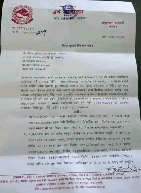 निर्माण व्यवसायीको भुक्तानी पाउने गरी अर्थ मन्त्रालयले नीतिगत निर्णय गरेर भौतिक पूर्वाधार, ऊर्जा, खानेपानी तथा सहरी विकास मन्त्रालयहरूमा परिपत्र गरिसकेको छ।