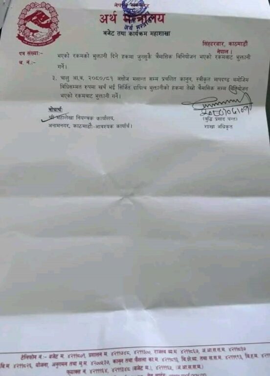 उक्त भुक्तानी दसैँअघि नै निर्माण व्यवसायीका खातामा जाने गरी व्यवस्था गरिएको अर्थ मन्त्रालयले जनाएको छ।अर्थ मन्त्रालयका प्रवक्ता धनीराम शर्माले विभिन्न मन्त्रालय अन्तर्गतका परियोजनामा अघिल्लो आवको दायित्व भुक्तानी निकासा दिने निर्णय भएको जानकारी दिए ।
